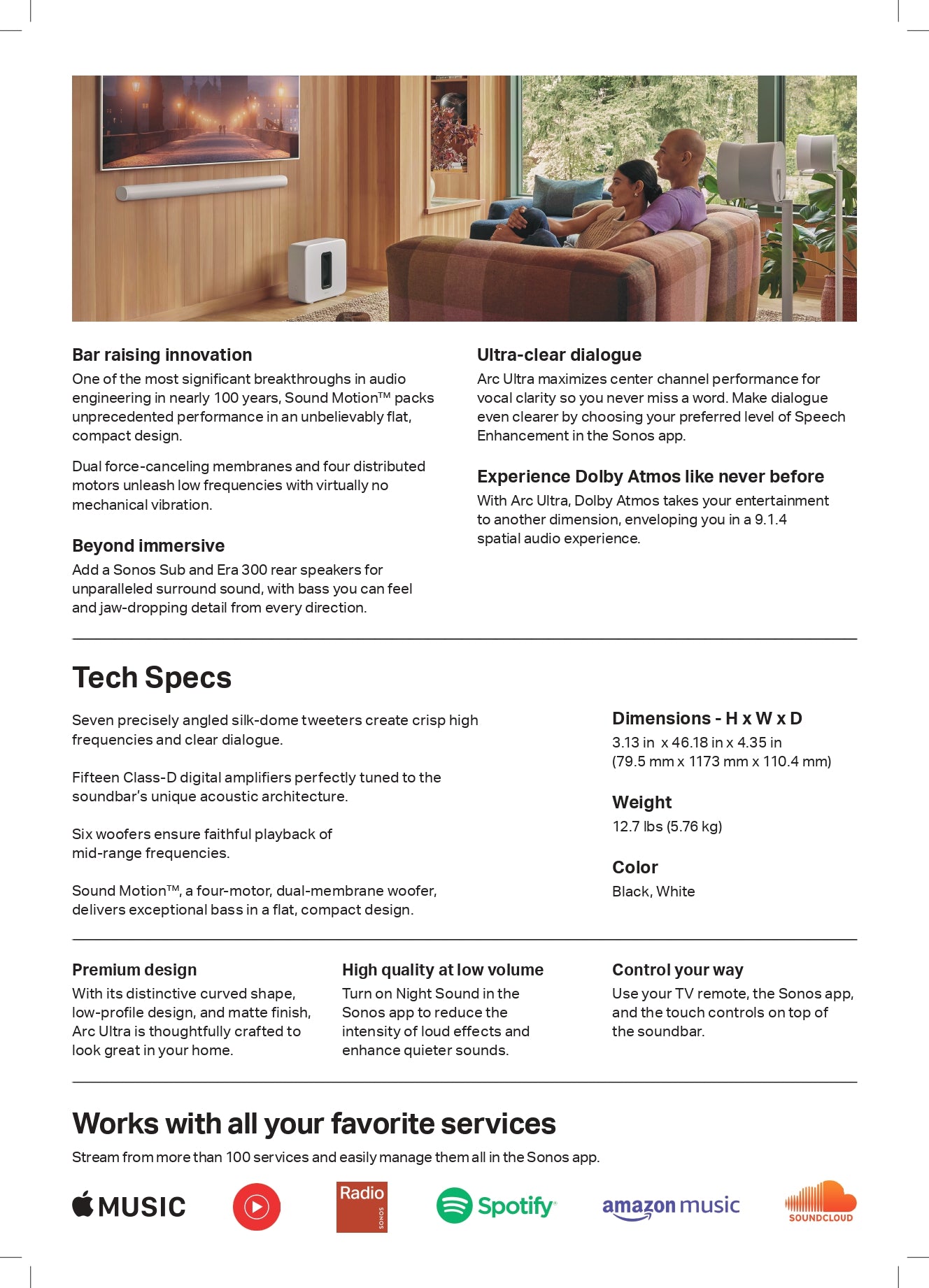Setting up the Arc Ultra is a breeze with the included HDMI cable, and you can easily control it with your TV remote. Alternatively, you can use the Sonos app, touch controls on top of the soundbar, Sonos Voice Control, or Amazon Alexa. When your TV is off, you can stream music and more from your favorite services using WiFi or Bluetooth.